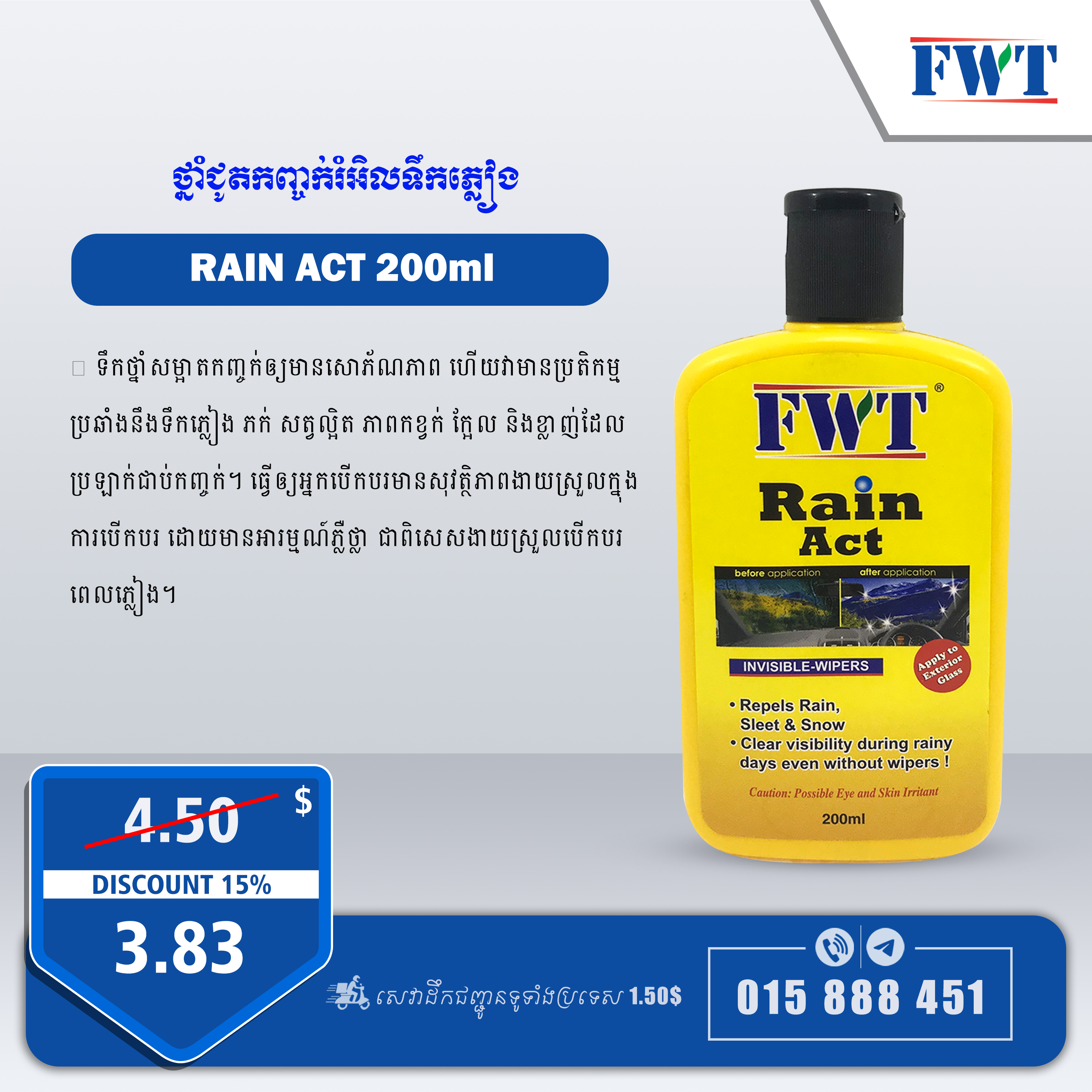 ទឹកថ្នាំសម្អាតកញ្ចក់ឲ្យមានសោភ័ណភាព ហើយវាមានប្រតិកម្ម ប្រឆាំងនឹងទឹកភ្លៀង ភក់ សត្វល្អិត ភាពកខ្វក់ ក្អែល និងខ្លាញ់ដែល ប្រឡាក់ជាប់កញ្ចក់។ ធ្វើឲ្យអ្នកបើកបរមានសុវត្ថិភាពងាយស្រួលក្នុង ការបើកបរ ដោយមានអារម្មណ៍ភ្លឺថ្លា ជាពិសេសងាយស្រួលបើកបរ ពេលភ្លៀង។